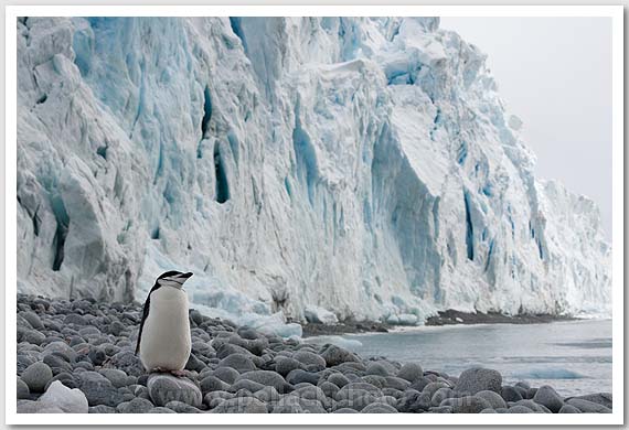 Chinstrap penguin and glacier face, Greenwich Island, South Shetlands